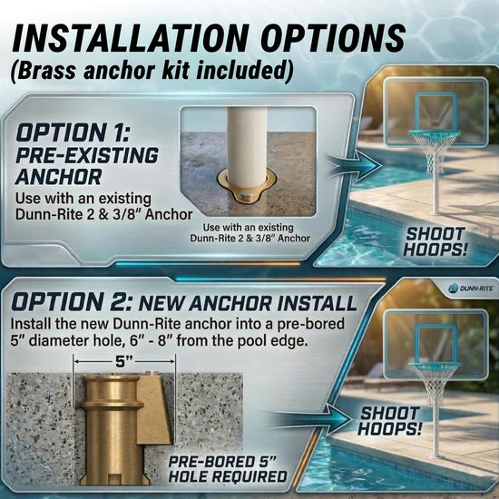 - Installation: either install in a pre-existing 2 & 3/8" Dunnrite brass anchor installed on your pool deck or install the included anchor kit in a 5" diameter hole in your pool deck 4 to 6 inches from the edge.