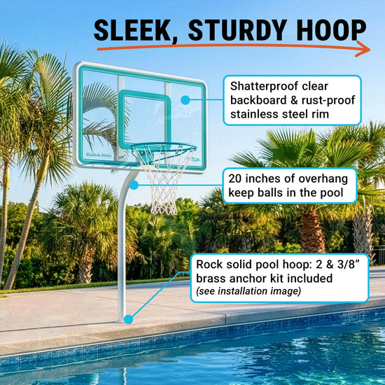 Transform your pool into the ultimate backyard destination with the Deck Shoot Deck-Mounted Clear Basketball Hoop. This semi-permanently installed system brings a clean, high-end look and professional feel to any in-ground pool.