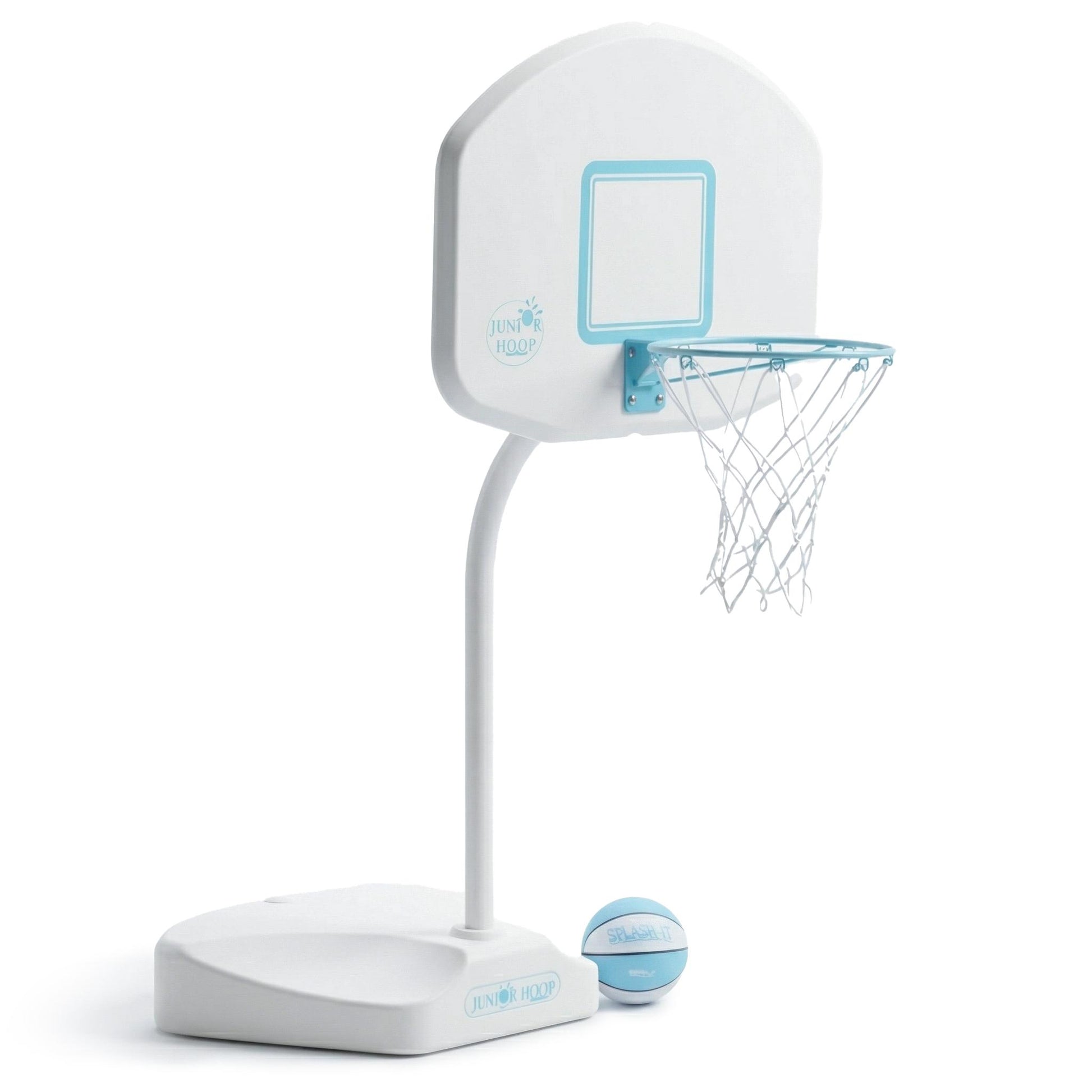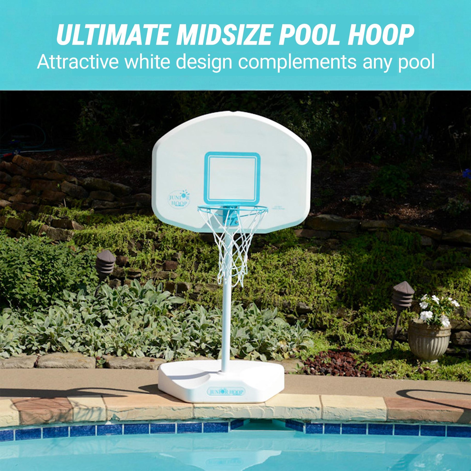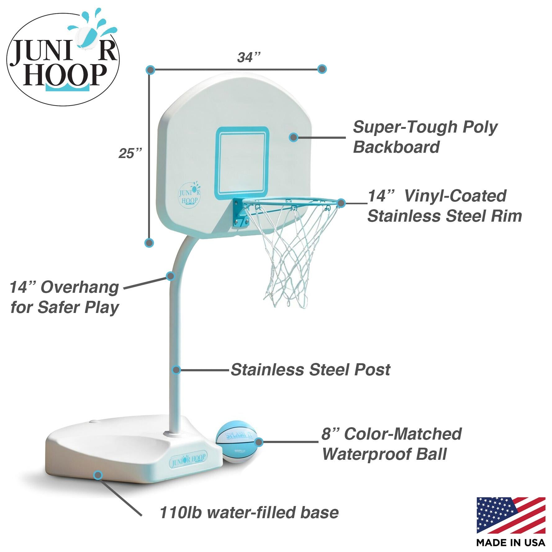 A midsize pool basketball hoop for saltwater & freshwater system pools or lakes and ponds The Junior Hoop enjoys the same premium quality as our larger regulation sized basketball sets but has a smaller footprint and is more compact. Perfect fit for younger players or if you're looking for a sleeker unit this poolside basketball unit is great for the whole family - everyone will feel like a pro. Comes with everything you need before the big game's tip-off: rim, basketball, backboard, base and hardware.