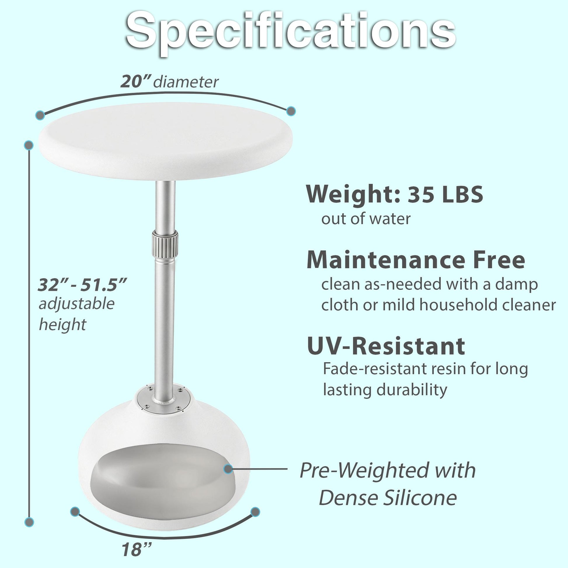 Keep the party in the pool with the Submersa pool bar table for inground and above ground pools. The bar height can be easily adjusted by hand for a height of 32 to 51.5 inches to accommodate any pool bar scene. Made of rugged polyethylene with 4 soft-tipped, vinyl-safe adjustable leveling feet to accommodate sloped pool floors.