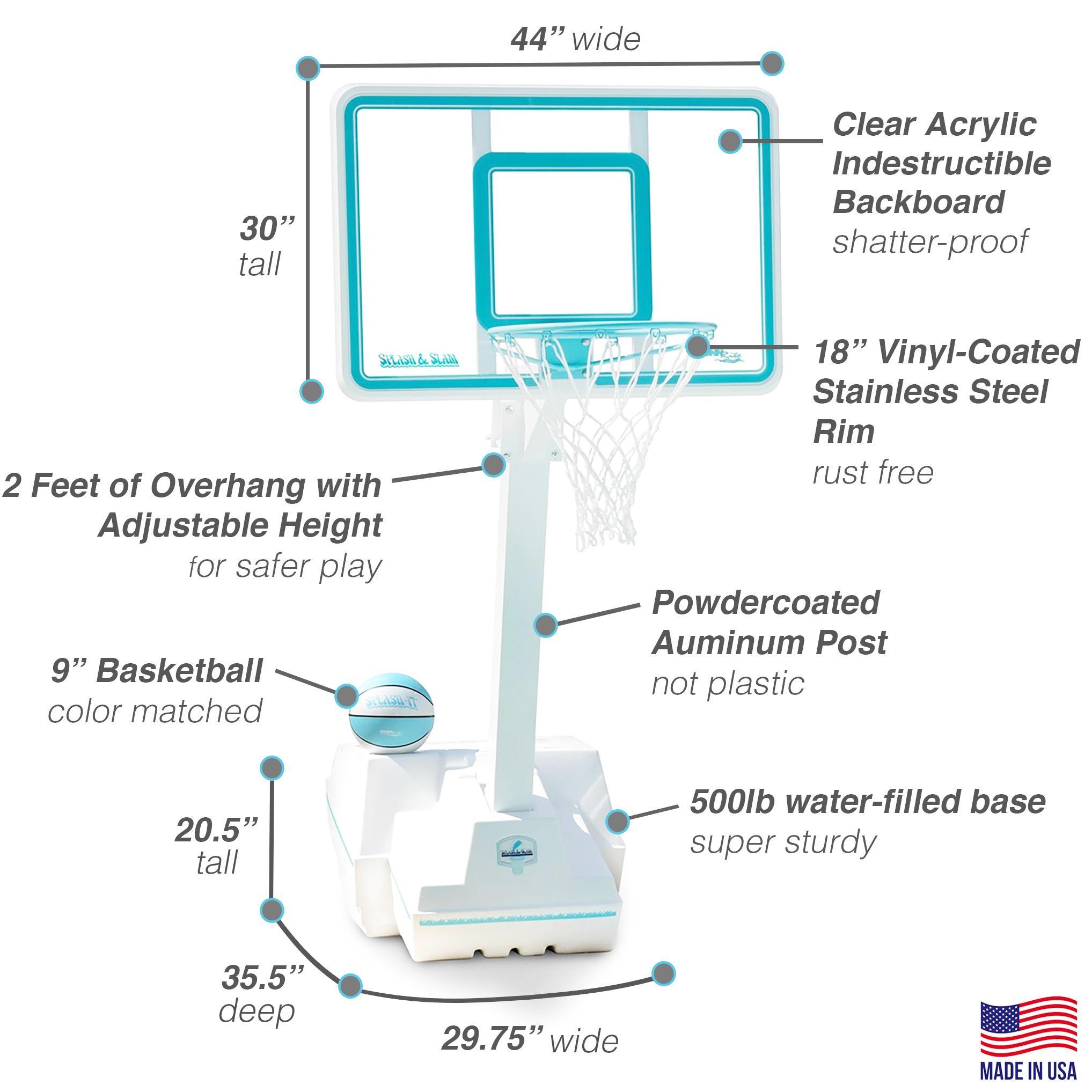 State-of-the-art pool basketball set that is easily adjustable anywhere from 2 feet to 6 feet above water. The Splash and Slam Clear Pool basketball hoop is insanely sturdy at 500lbs and ready for the rowdiest games of pool hoops!